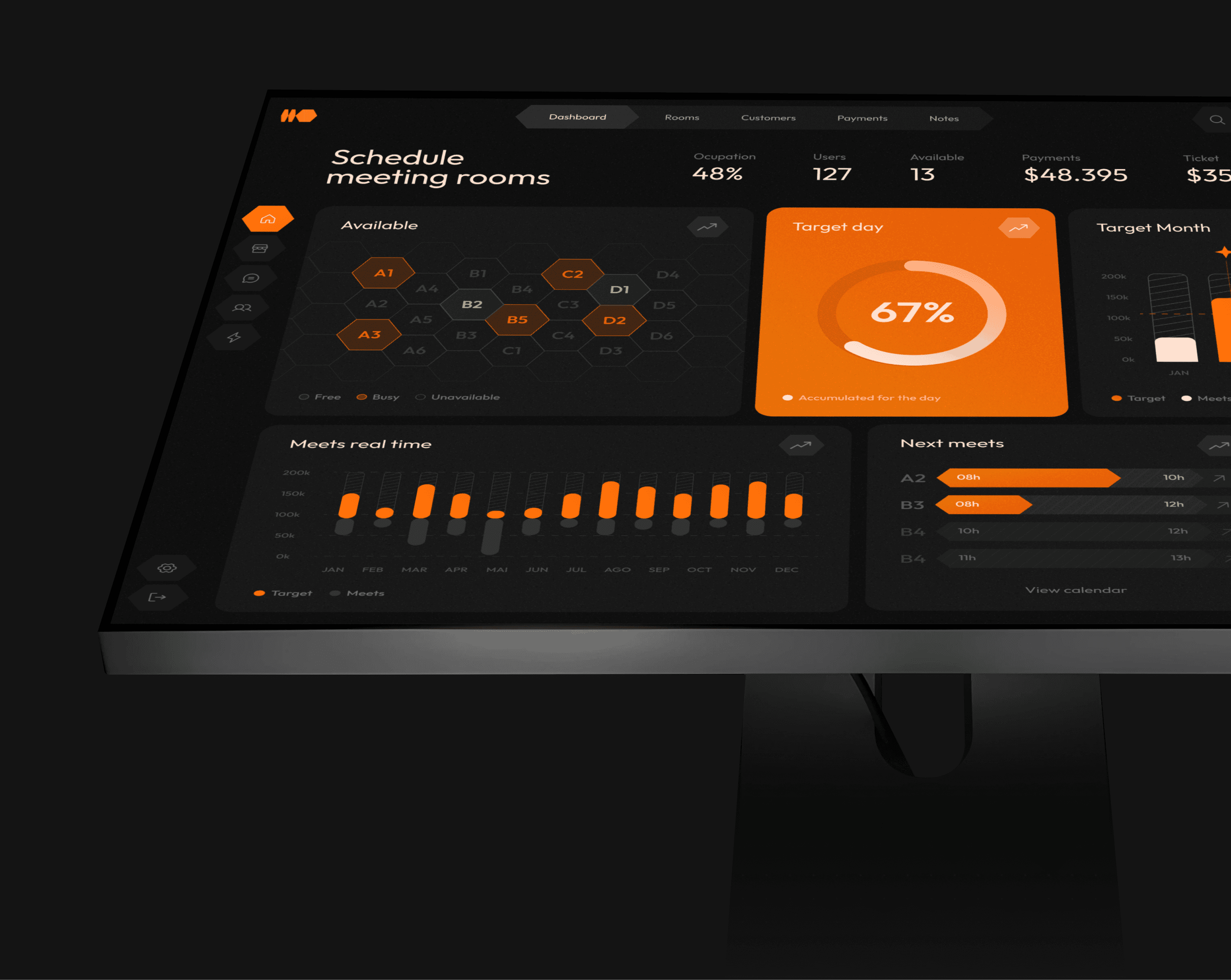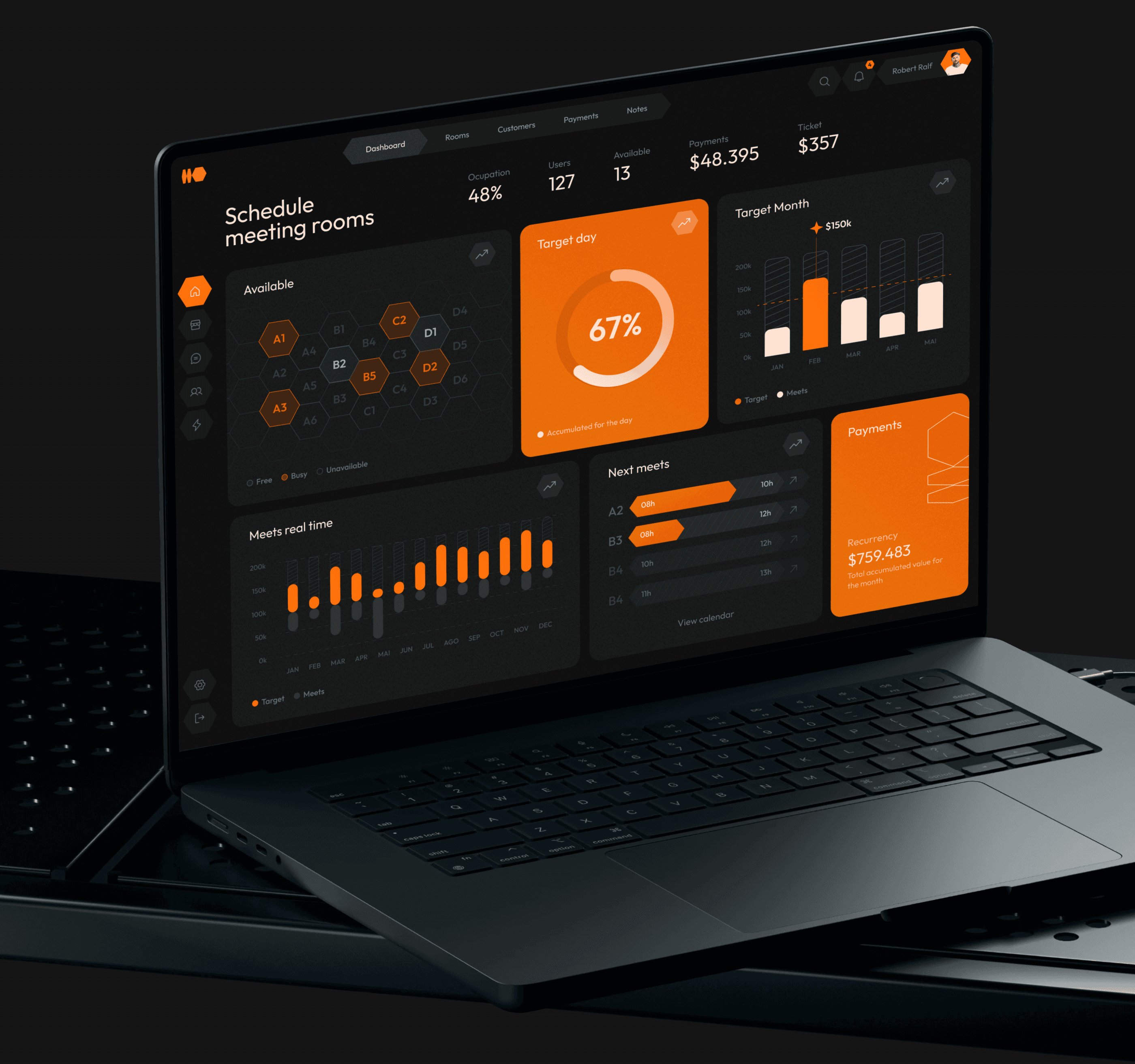 Openworks is a management and BI dashboard focused on coworking spaces. It centralizes occupancy monitoring for all rooms, real-time financial performance, and future scheduling in a single interface.